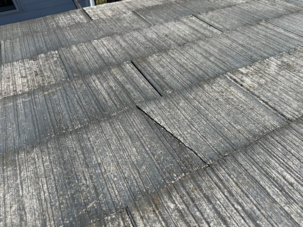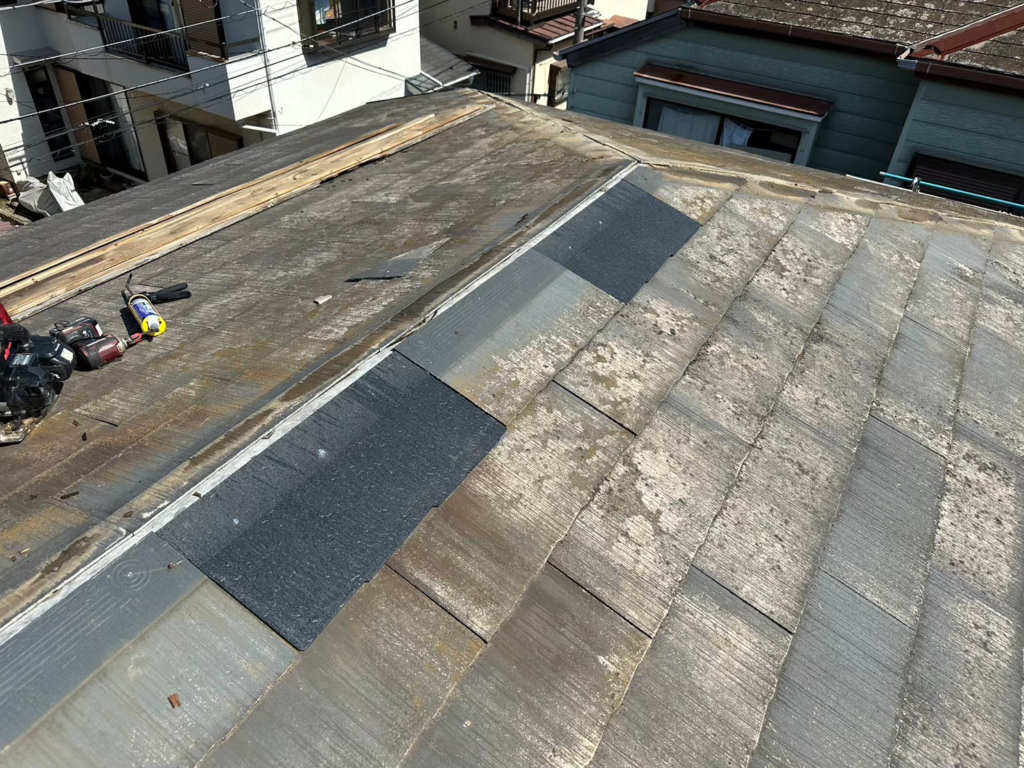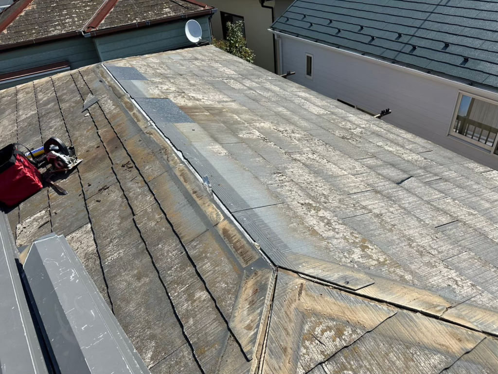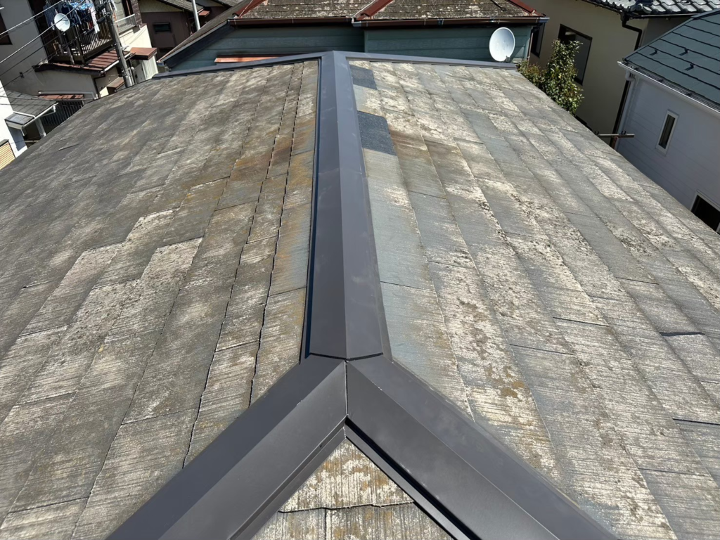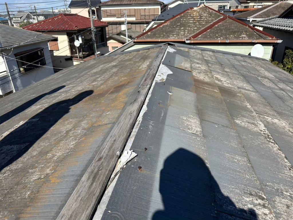 こうしてみると瓦も限界がきているので、本当は葺き替えをお勧めしたいのですが、予算が合わなかったため、今回は棟板金交換工事になりました。