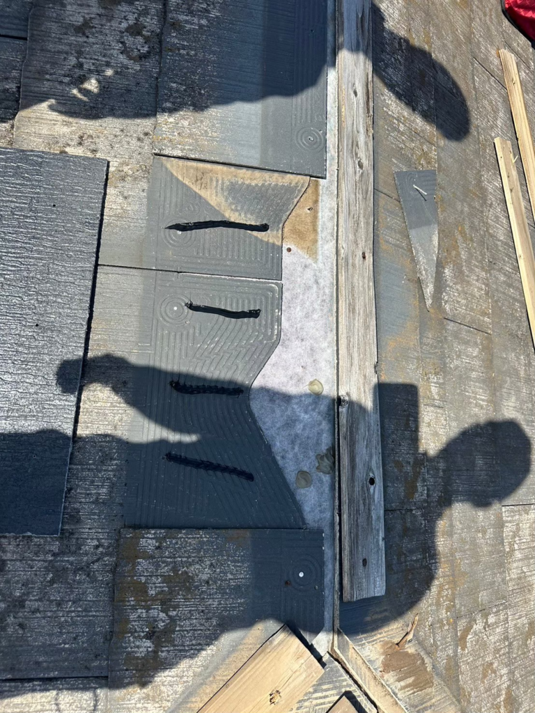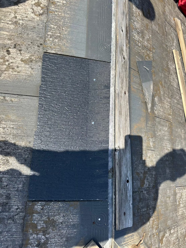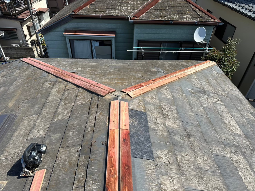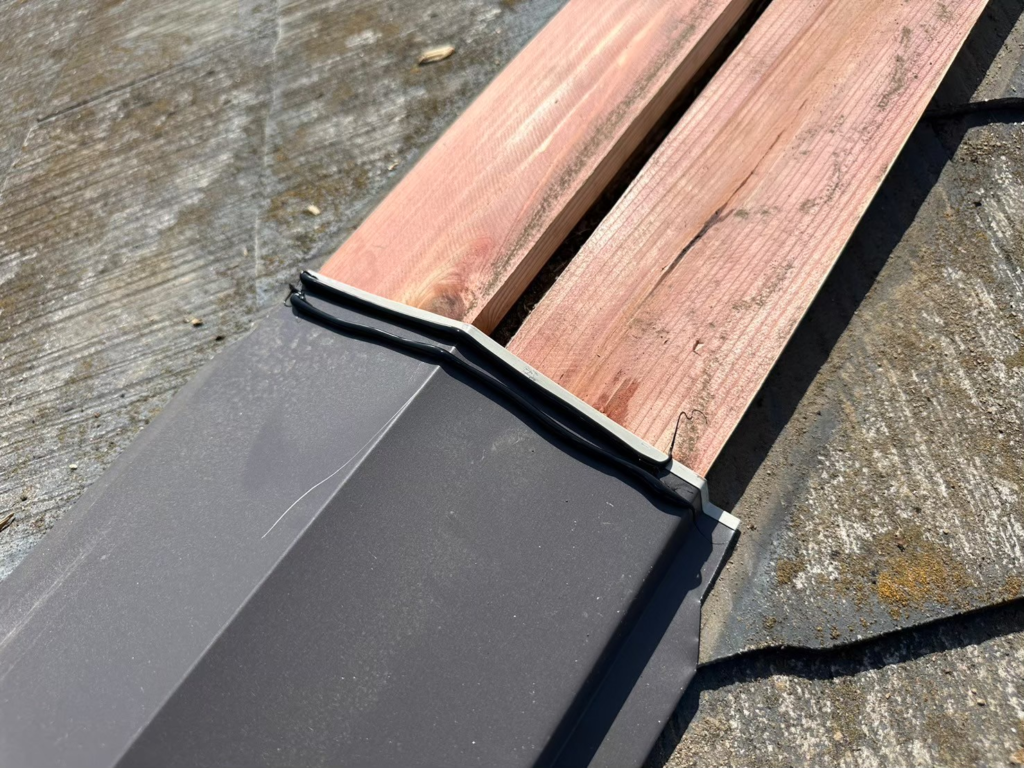 既存の写真がこちらになります。大棟部分の板金が全て飛んでおり、下地の貫板も片っぽしかなく、雨が降ったらダダ入り状態になります!板金がどこに飛んだかわからないようで、他のお家や車、ましてや人に当たってしまうと大変なことになってしまうので注意が必要です。