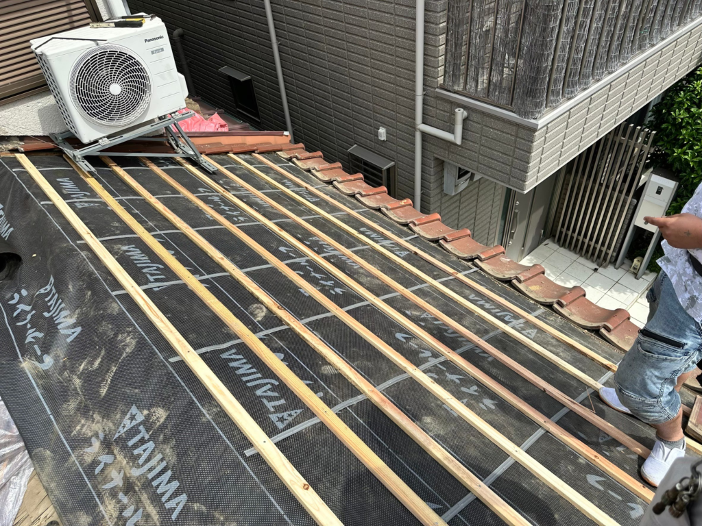 ルーフィングを張り付け、そのあとに胴縁まで取り付けました。この胴縁は瓦の爪部分を引っ掛ける役割があるので少しもずらさず、地割りをすることが重要です!